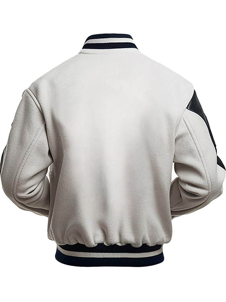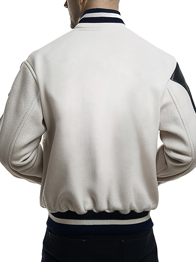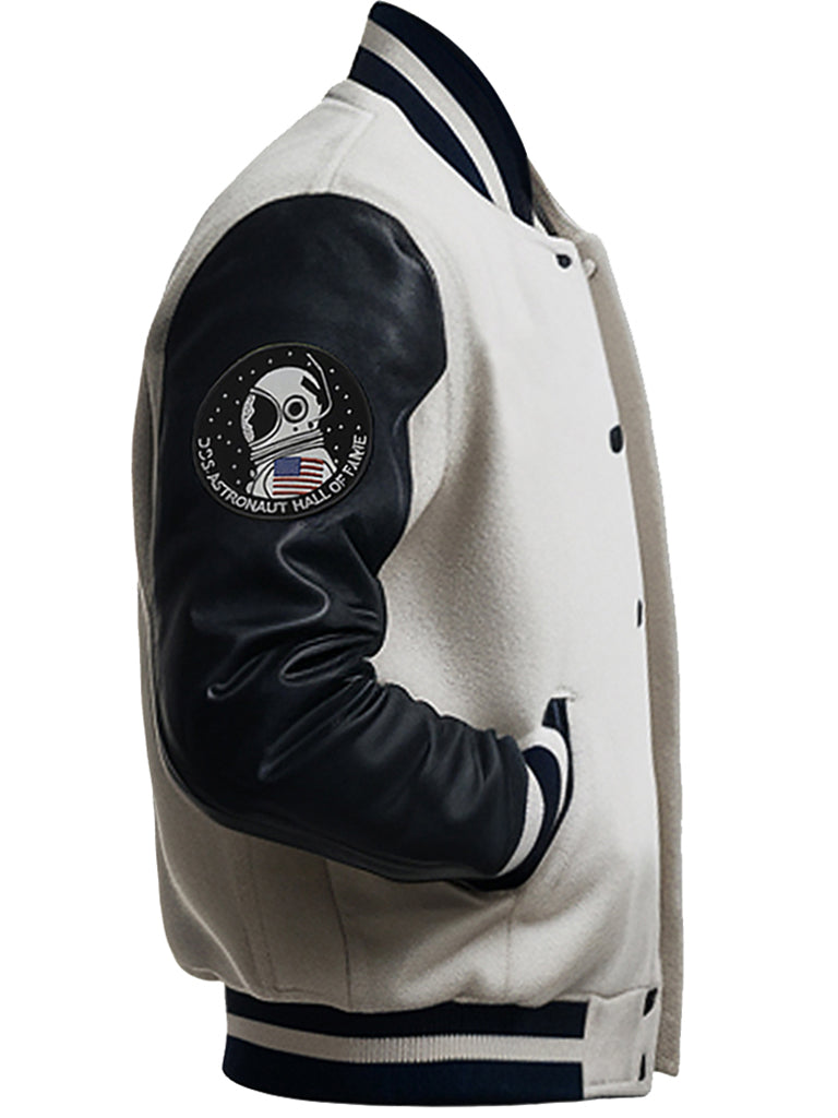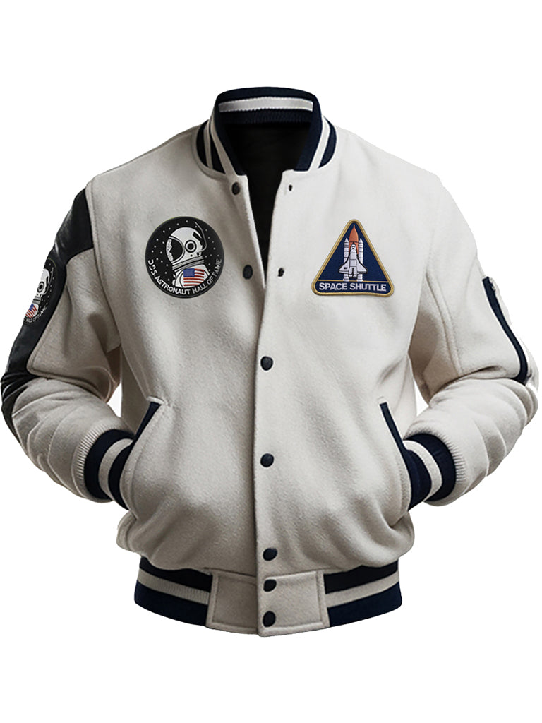 This men's varsity jacket is a stylish and unique piece, perfect for adding a touch of space-themed flair to your wardrobe. Made from high-quality materials, it features a classic varsity jacket design with a snap-button closure. The jacket is primarily white with black accents on the shoulders and sleeves. It is adorned with detailed NASA and astronaut-themed patches, adding an element of interest and authenticity. The ribbed collar, cuffs, and hem ensure a snug and comfortable fit, while the front pockets offer practicality. Ideal for fans of space exploration, this jacket combines fashion and function effortlessly.
