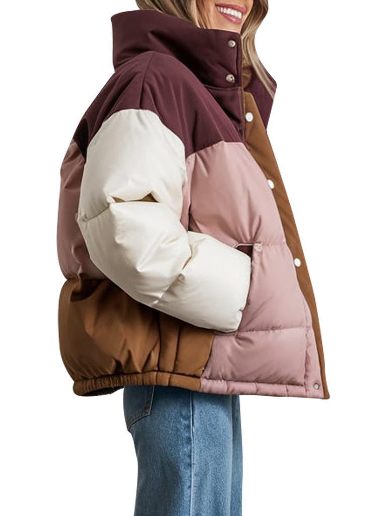 Fashionable and toasty this winter with our Color Block Puffer Jacket for Women. This jacket is meant to be warm and comfortable and has a nice shade of colors that will help to cheer up any winter day. Its lining is thick so as to provide maximum warmth during the worst of weathers all the time. It has a high collar to protect you from the wind and is easy to wear because it has a front snap button closure. This jacket is perfectly worn over the sweaters or tops which makes it the ideal compliment for the winter season.