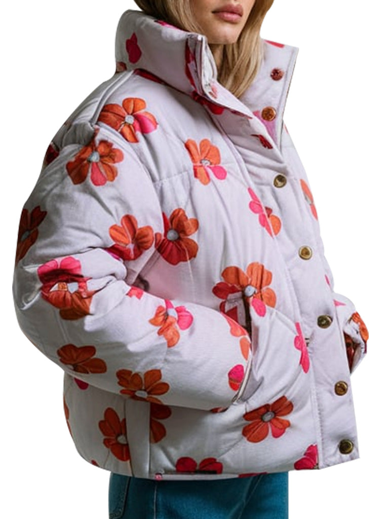 This floral print puffer jacket will give you the perfect start into the winter season. This jacket features floral prints on the surface and has a quilted design which makes it fashionable and practical at the same time. It has a padded interior to make it warm and comfortable and comes with a high collar and buttoned front to keep the cold at bay. From a casual dinner to a night out, this floral quilted puffer is a great piece to add to your winter collection. Keep warm and look great while doing it in this charming and fashionable jacket.