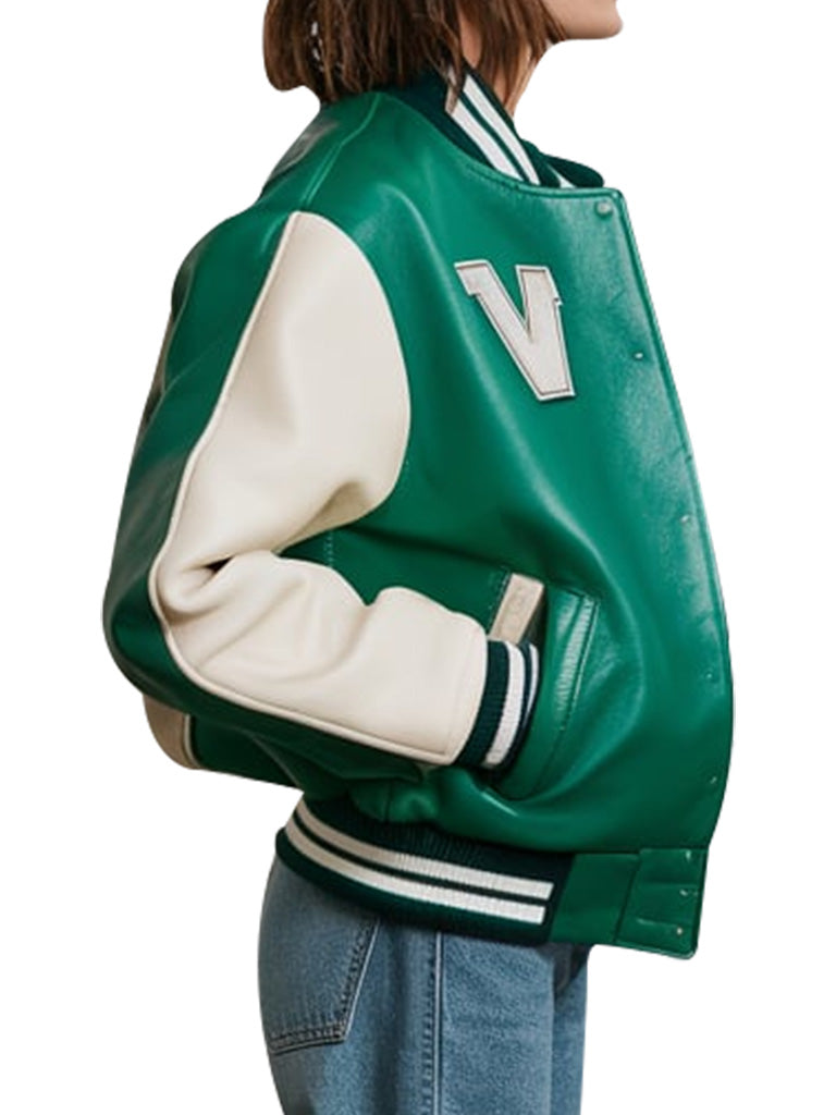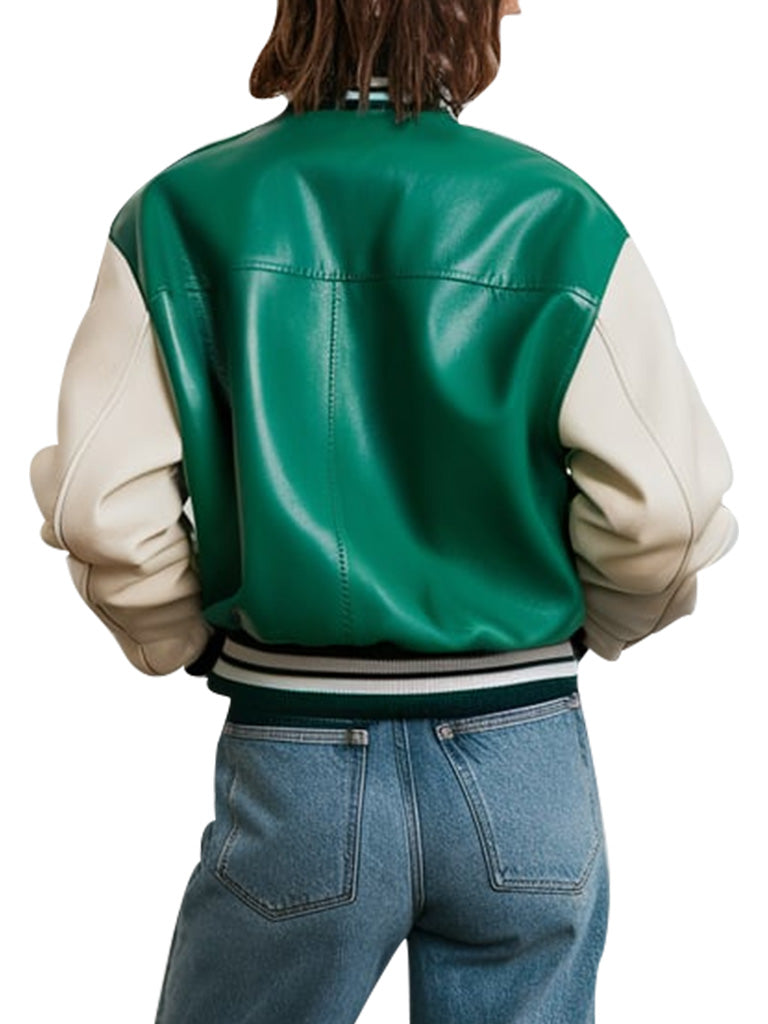 Elevate your casual wardrobe with this eye-catching green varsity leather jacket. Designed with a bold green body and contrasting cream sleeves, this jacket brings a fresh take on the classic varsity style. Made from high-quality leather, it's perfect for adding a stylish edge to any outfit. Whether you're layering it over a casual tee or pairing it with jeans for a laid-back look, this jacket is the perfect statement piece for any season.
