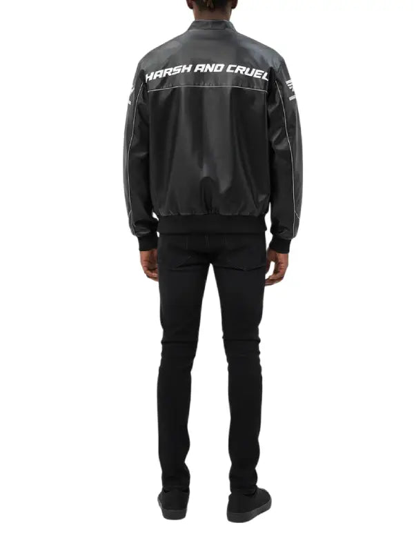 This Harsh and Cruel Racing Moto Jacket brings bold streetwear style with premium faux leather, sharp black and white paneling, and full racing graphics. Designed with a relaxed fit, soft inner lining, ribbed cuffs, and zip closure, it delivers comfort and a standout look for everyday fashion.