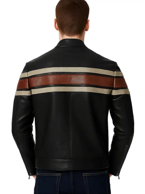 Give your wardrobe a sleek upgrade with this men’s black real leather racing jacket. Designed with premium craftsmanship, it features striking brown and beige stripe detailing across the chest and sleeves. The smooth zip closure, soft inner lining, and modern fit make it perfect for casual wear, riding, or night outings. A stylish piece that blends luxury with everyday comfort.