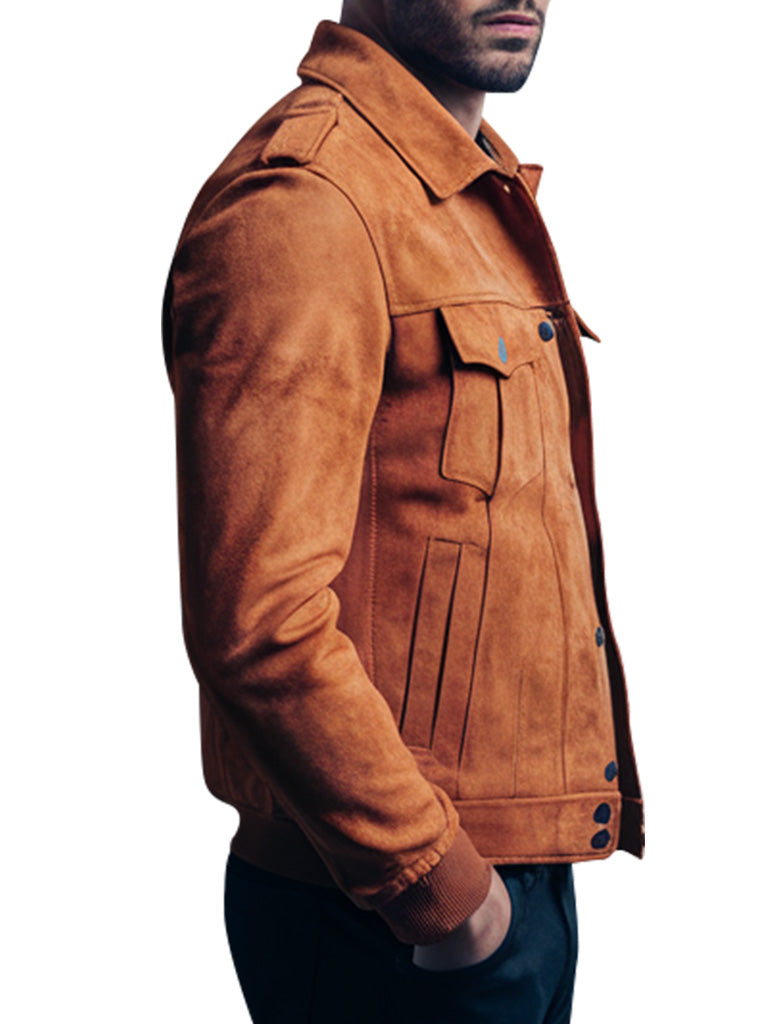 This brown suede leather jacket for men is one of the most popular and comfortable pieces of clothing that can be worn in every occasion and in every season. The outside material is suede to provide the comfort and the style is that of a bomber but is tapered and sleek and can easily be worn at formal to even business formal affairs. The garment was especially produced with buttons, front opening, two flap breast pockets, ribbed cuffs and hem that makes it retro and quality fit to wear. This jacket is of that general brown color that can easily be blended with any type of cloths and will be very suitable and handy during cold seasons.