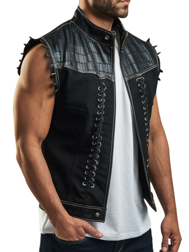 Upgrade your wardrobe with this striking Men's Black Crocodile-Embossed Leather Panel Vest, a perfect fusion of rugged style and modern detailing. This sleeveless vest features crocodile-embossed leather panels across the shoulders for a textured finish, complemented by durable side lacing that adds both flair and a tailored fit. The high-quality craftsmanship ensures durability and comfort, making this vest ideal for bikers, musicians, or anyone looking to elevate their streetwear. With its sharp design and edgy appeal, this vest makes a bold statement while offering versatile wearability.