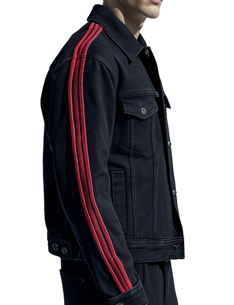 Elevate your casual wardrobe with this Men's Black Denim Jacket featuring bold red stripes along the sleeves. Crafted from premium quality denim, this slim-fit jacket combines style and comfort, making it perfect for any casual occasion. The button-up front and chest pockets add a classic touch, while the red stripes provide a modern, sporty vibe. Whether you're heading out for a weekend outing or just need an extra layer, this jacket is a versatile addition to your wardrobe. Pair it with your favorite jeans for a coordinated look or mix and match for a unique style