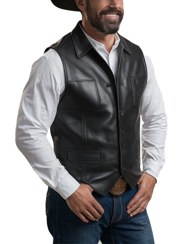 This Men's Black Handmade Western Leather Vest is the perfect blend of style and durability, tailored for those who appreciate a rugged, classic look. Crafted from premium quality leather, this vest features a smooth finish with a snap-button front closure, adding a timeless touch to your wardrobe. Designed with practical chest and waist pockets, it ensures functionality while maintaining a sleek appearance, making it ideal for both casual and formal occasions. Whether you're heading to a rodeo or enjoying a night out, this leather vest embodies the spirit of adventure with a contemporary twist.