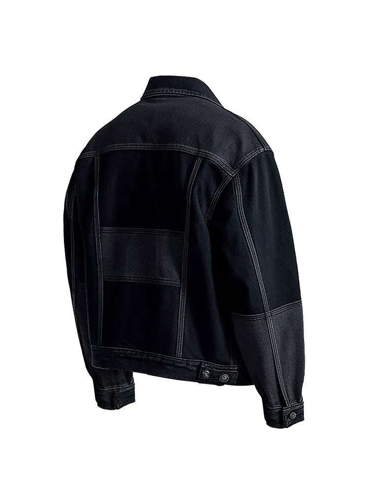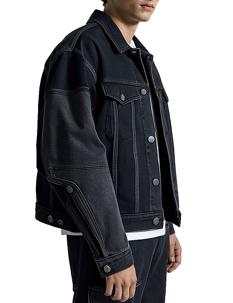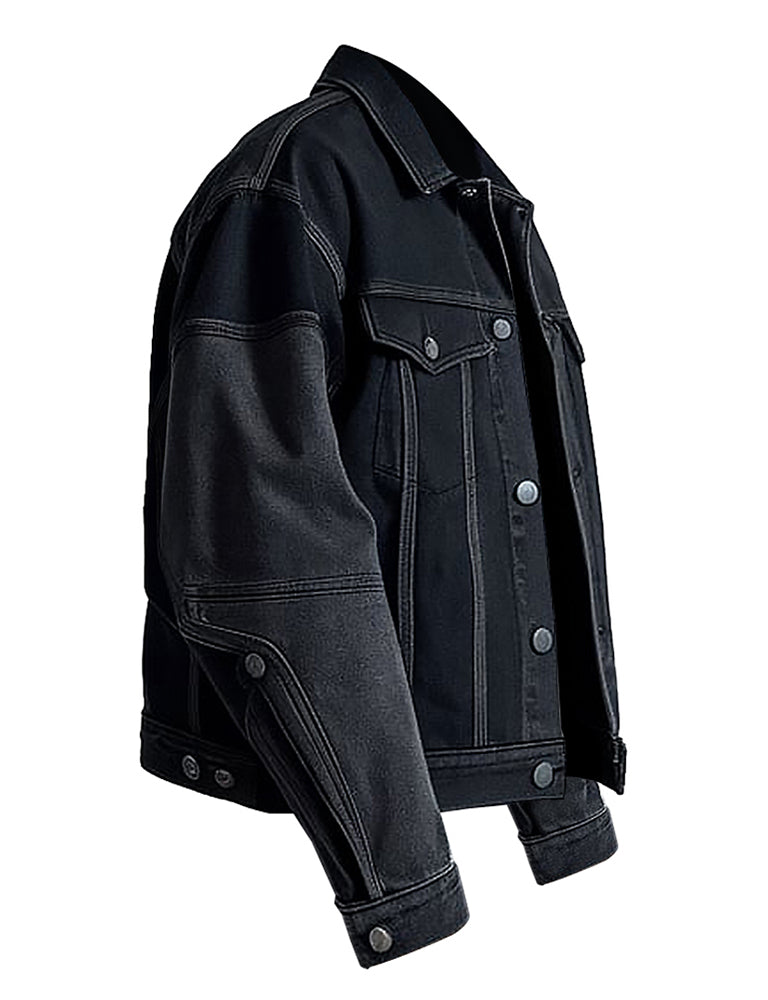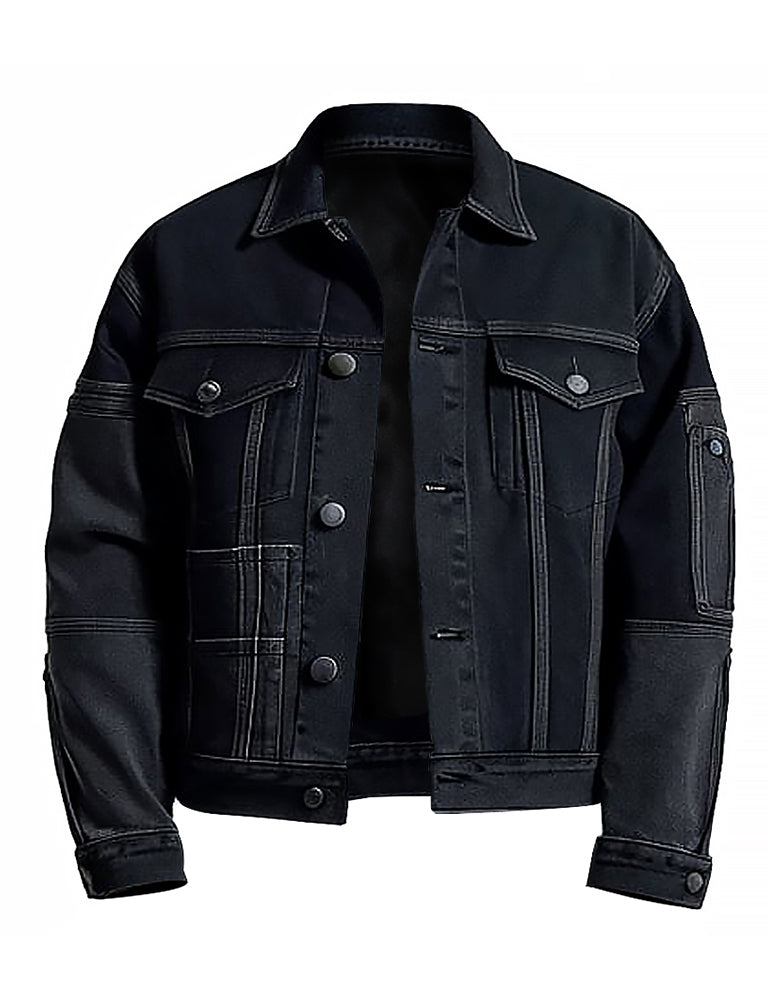 Elevate your streetwear game with this Men's Black Denim Jacket featuring sleek contrasting panels. This versatile jacket combines contemporary style with classic denim durability, making it a must-have for any wardrobe. Whether you're dressing up or down, this jacket adds a touch of edgy sophistication to your look. Perfect for any season, this black denim jacket offers both comfort and style, making it ideal for casual outings or a night on the town.