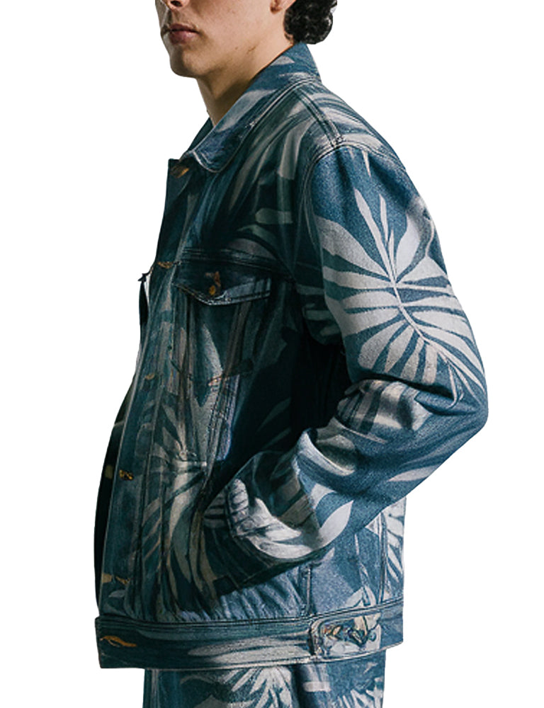 Elevate your casual style with this Men's Blue Leaf Print Denim Jacket. Crafted from high-quality denim, this jacket features a unique leaf print that adds a touch of sophistication to your everyday look. The slim fit design ensures a flattering silhouette, while the classic button-down front and sturdy construction provide both style and durability. Perfect for layering over your favorite tees or shirts, this jacket is a versatile addition to any wardrobe. Whether you're going for a laid-back vibe or looking to make a statement, this vintage-inspired denim jacket has got you covered.