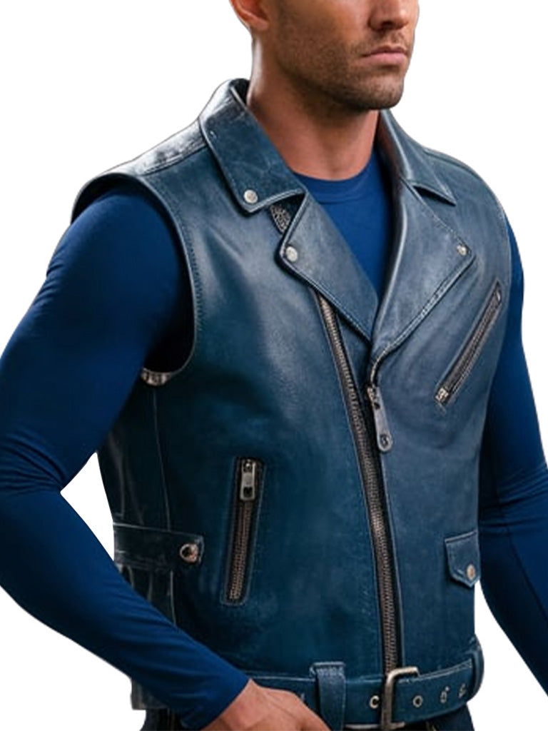 Elevate your biker style with this Men's Blue Leather Biker Vest, designed for those who love to make a statement. Crafted from premium quality leather, this vest features an eye-catching blue hue and intricate zipper details that add a bold edge to your look. The asymmetrical front zip closure, multiple zippered pockets, and adjustable waist belt provide both functionality and style, making it a versatile addition to any wardrobe. Perfect for layering over a casual shirt or sweater, this vest is ideal for motorcycle enthusiasts or anyone seeking a rugged, stylish edge.