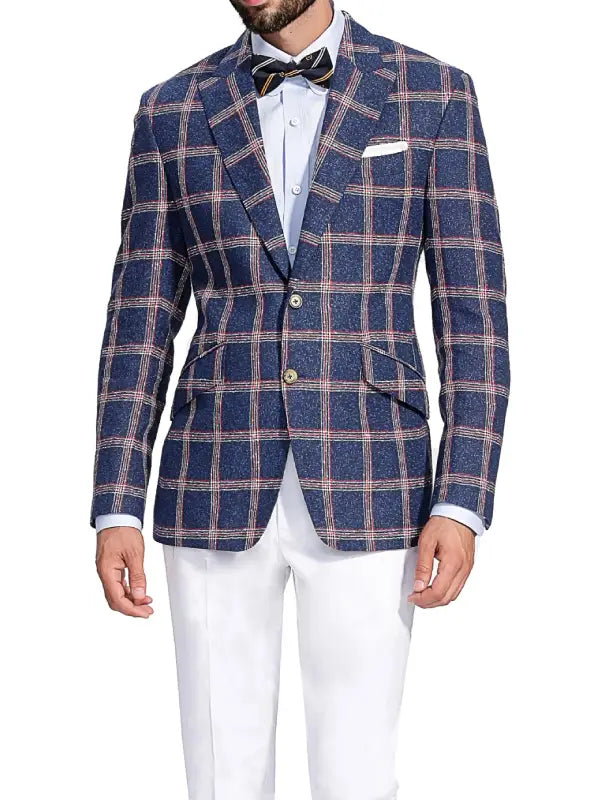 Elevate your smart casual and semi formal wardrobe with this Men’s Blue Windowpane Check Blazer, designed for refined taste and versatile styling. The blazer features a deep blue base enriched with a bold windowpane pattern in soft beige and red tones, giving it a confident classic look with a modern twist. Tailored with clean lines and a structured silhouette, it offers a perfect blend of comfort and sophistication.