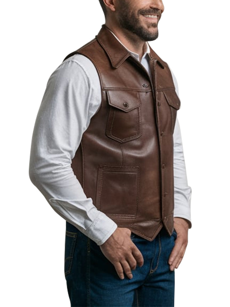 This Men’s Classic Brown Leather Vest is a perfect example of how you can have both style and practicality in your clothing. This vest is made from genuine leather and has a classic cut that will fit perfectly to the figure. It has a pointed collar and button front fastening that gives it a timeless look which can be worn on casual and formal occasions. Flap chest pockets and lower patch pockets are added to the vest to give you enough pockets for your belongings and style at the same time. The brown hue is rich and warm, which makes it suitable to be paired with almost any type of clothing. This leather vest is comfortable and long lasting, making it a great addition for anyone who loves quality and style.