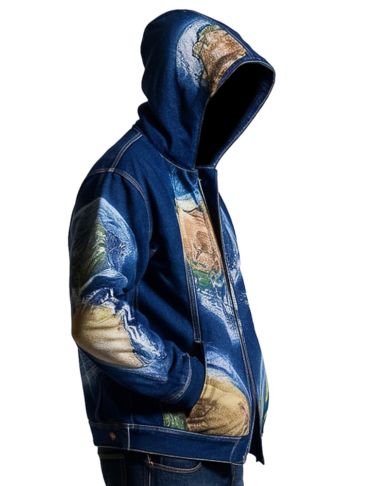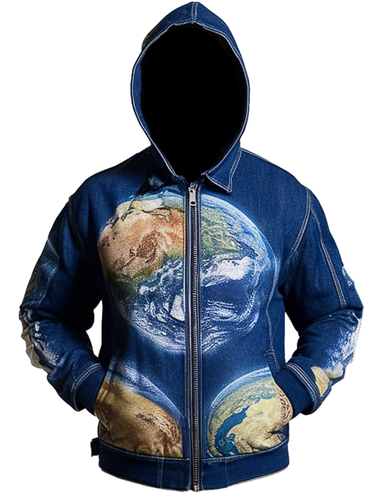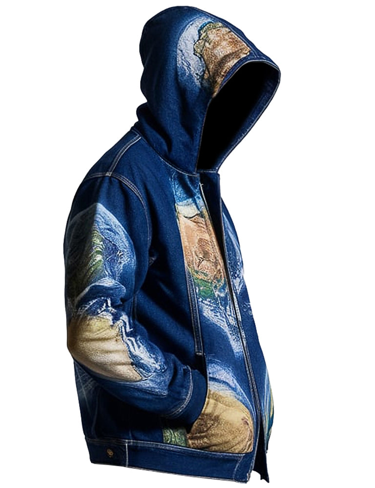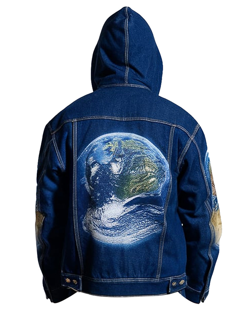 Stand out with this striking Men’s Earth Print Hooded Denim Jacket, showcasing a vibrant and detailed print of our planet on a high-quality denim fabric. This jacket is perfect for those who want to express their love for nature and style in a single, bold statement piece. The attached hood adds a casual and cozy touch, making it versatile for various occasions. With durable construction and a comfortable fit, this jacket is both functional and fashion-forward, ideal for adding an artistic flair to your wardrobe.