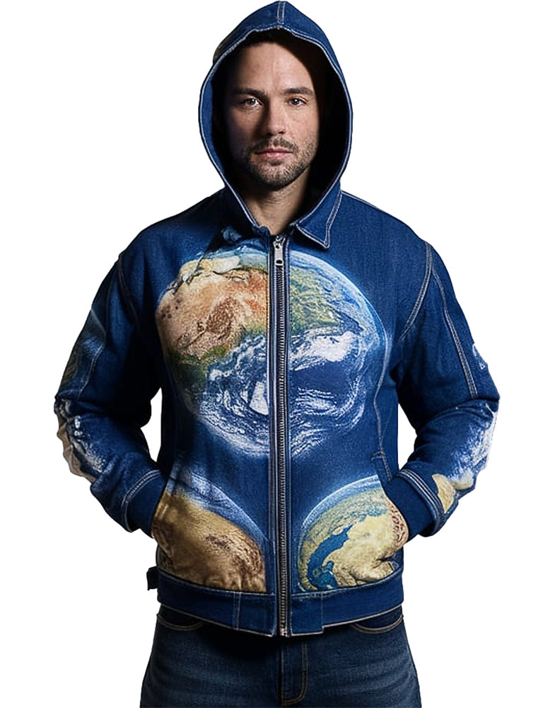 Stand out with this striking Men’s Earth Print Hooded Denim Jacket, showcasing a vibrant and detailed print of our planet on a high-quality denim fabric. This jacket is perfect for those who want to express their love for nature and style in a single, bold statement piece. The attached hood adds a casual and cozy touch, making it versatile for various occasions. With durable construction and a comfortable fit, this jacket is both functional and fashion-forward, ideal for adding an artistic flair to your wardrobe.