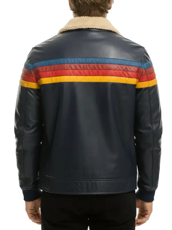 Step into effortless style with this navy leather jacket designed with bold multicolor stripes and a warm shearling collar. The premium leather build gives a smooth feel and long lasting durability while the soft inner lining keeps you comfortable in every season. Finished with ribbed cuffs and secure zip pockets, this jacket brings a perfect mix of retro vibes and modern streetwear. A great choice for casual outings, winter layering, and anyone who wants a standout look with quality craftsmanship.