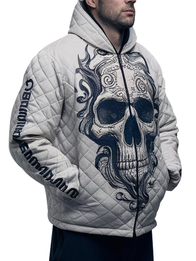 This men’s quilted hoodie jacket is perfect for your casual wear since it comes with a skull graphic that adds a touch of attitude. This hoodie jacket is designed for the ultimate warmth and comfort while also not compromising on fashion. The design on the front, back and sleeves is elaborate and the quilted pattern on the body gives it an artistic look and feel as well as a comfortable fit. Ideal for hiking and other outdoor activities, this jacket is constructed from only the best fabrics that guarantee the wearer a long-lasting and weather-resistant garment. This skull graphic hoodie jacket is perfect for a street style or for those who are in need of a good outerwear to wear.