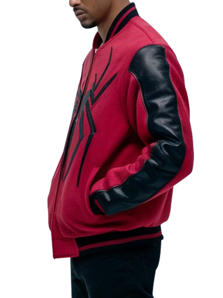 Embrace bold style with this Red and Black Spider-Inspired Varsity Jacket, designed for those who aren't afraid to stand out. Crafted with premium materials, this jacket features a striking black spider design that spans across the back, making it a perfect addition to any wardrobe. The sleek, red base color contrasts with the black leather detailing on the sleeves, creating a statement look. Whether you're attending an event or just want to level up your everyday streetwear, this varsity jacket delivers comfort, durability, and undeniable style.