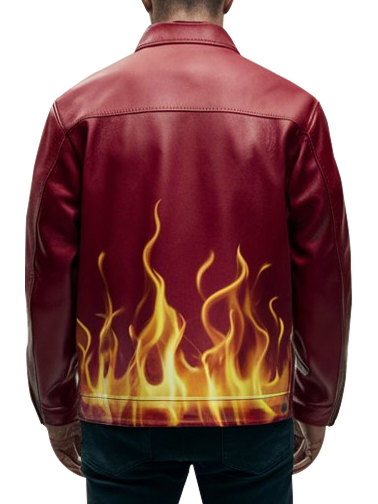Ignite your style with this bold red leather jacket, featuring a striking flame print at the bottom. Crafted from high-quality leather, this jacket offers a sleek and edgy look, perfect for standing out in any crowd. The unique flame design adds a fiery touch, while the buttoned closure and minimalist collar enhance its sleek silhouette. Whether you're going for a casual day out or looking to make a statement at a special event, this jacket is a perfect addition to your wardrobe. It combines timeless craftsmanship with contemporary design for a look that’s as bold as you are.
