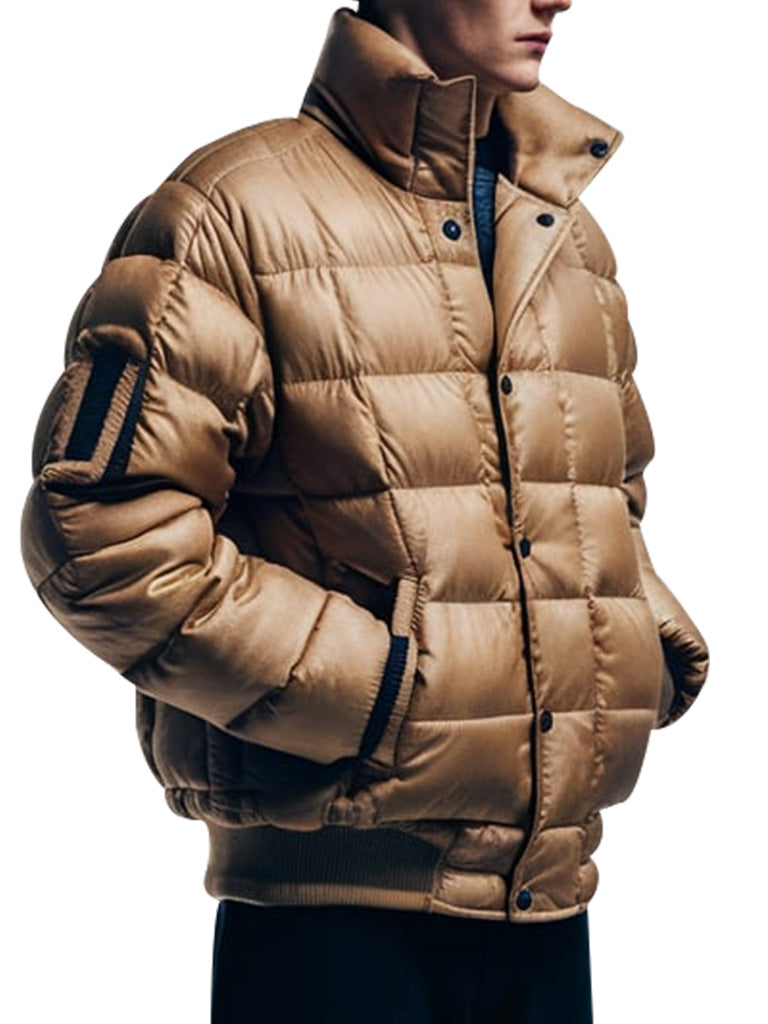 Keep warm and fashionable in this men’s tan quilted puffer jacket for the winter season. Made from quality fabrics, this jacket offers warmth and is not heavy. It’s very stylish and tanned for that chic look that can complement any ensemble, making it perfect wear for outdoor activities or everyday wear. The buttoned down flap on the back and extra cushioning on the cuffs add an extra layer of warmth even in cold weather. Whether you’re out hiking in the mountains or walking the city pavement, this puffer jacket will fill your need for both utility and style.