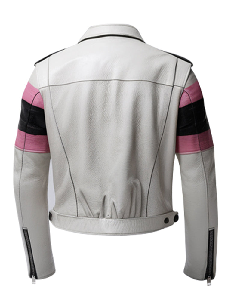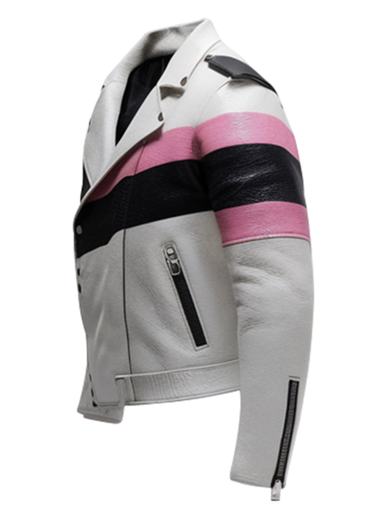 Stand out from the crowd in this stunning White Leather Biker Jacket, perfect for those who like to make a statement. This jacket has pink and black stripes on the chest and sleeves which gives it a different color from the usual black jackets. It is made of high quality leather and it provides comfort as well as durability to the rider while riding for casual outings and adventurous rides. The asymmetrical front zipper and the zippered cuffs are a little rough, and the secure pockets are functional yet stylish. Ideal for the people who enjoy wearing fashionable clothes while at the same time being comfortable, this jacket is your perfect companion during any weather.
