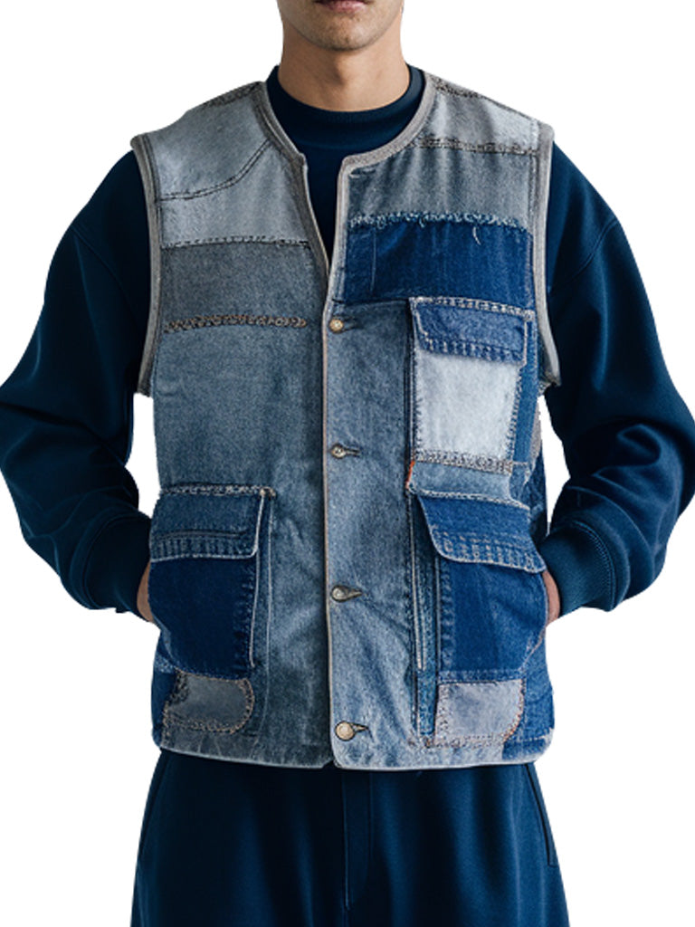 Embrace a stylish blend of vintage and contemporary fashion with our Patchwork Denim Vest for Men. This vest is crafted from a variety of denim shades, offering a unique patchwork design that makes it stand out from the crowd. The sleeveless design allows easy layering, while the multiple front pockets provide practicality for everyday use. Whether you're going for a casual look or something more rugged, this denim vest effortlessly adds a retro twist to any outfit. Perfect for all seasons, it combines comfort, utility, and undeniable style.