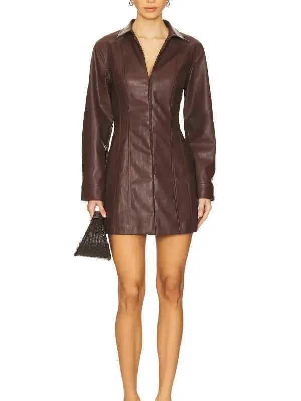 This brown leather mini shirt dress brings a clean modern look with a refined tailored shape. Made from smooth high quality leather, it features a fitted silhouette that skims the body and creates a flattering streamlined effect. The front closure is minimal which keeps the design sleek and polished from top to bottom.