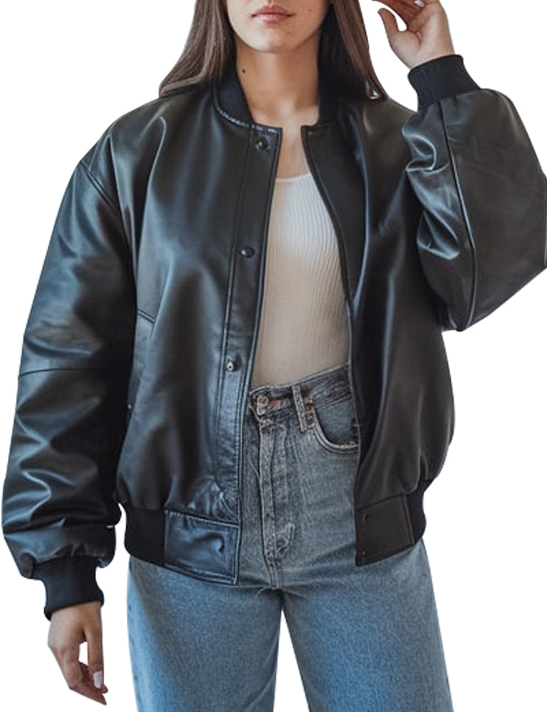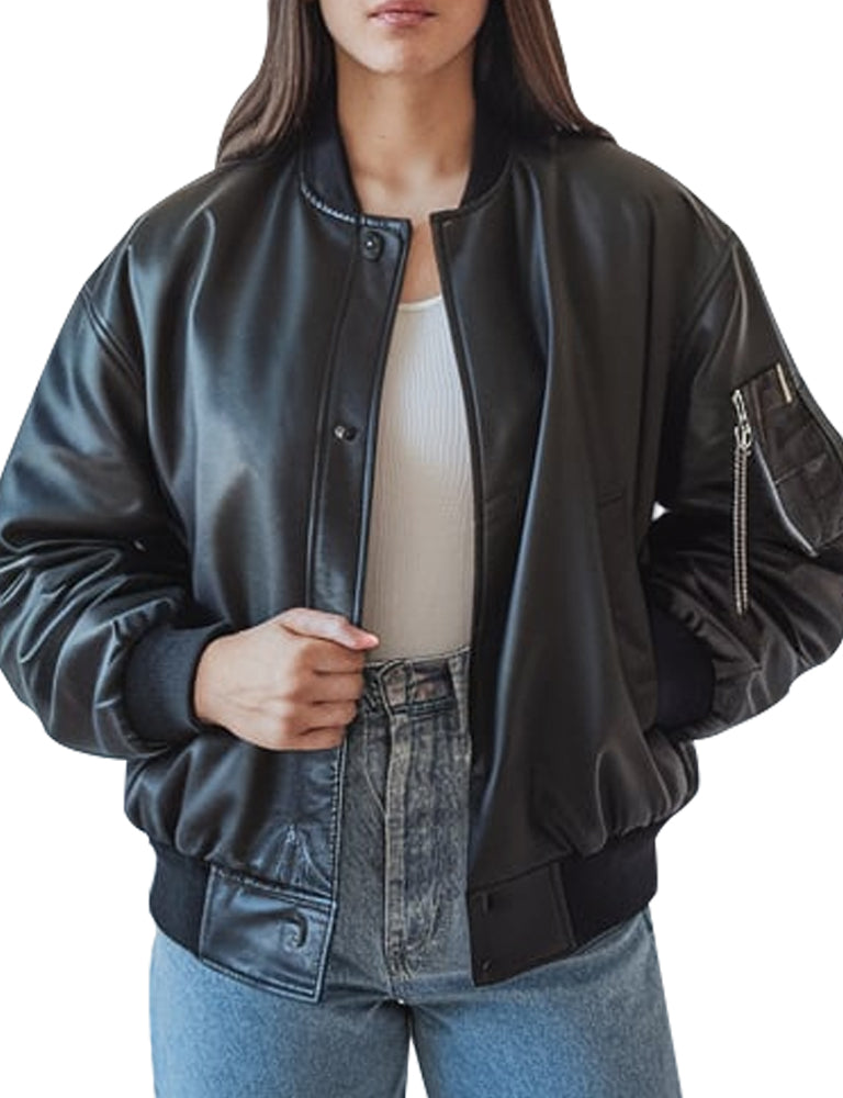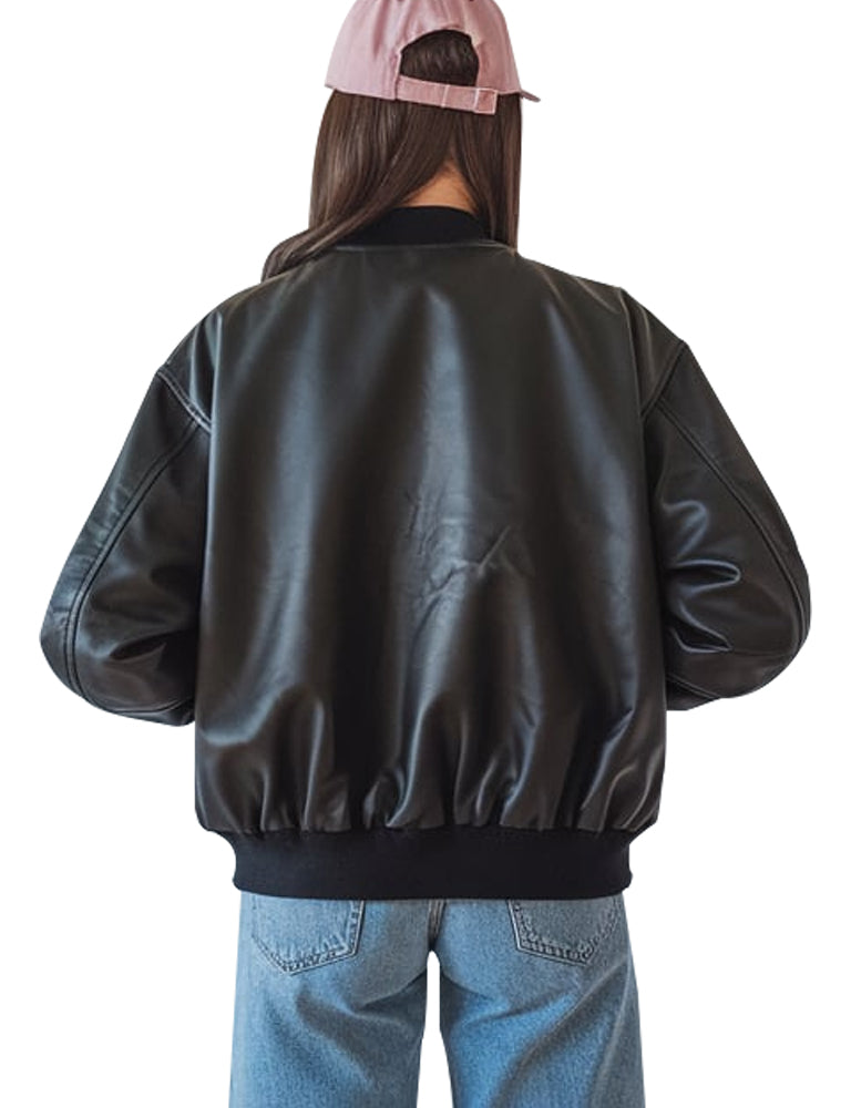 Stand out in style with this black faux leather bomber jacket. This jacket is stylish and comfortable and has been especially created for the contemporary woman. This jacket is a traditional bomber style with ribbed cuffs and hem and has a sleek leather look to it. Whether you are going out for the day or going out for the evening, this piece is sure to be your favorite. The jacket also has functional pockets and a zip front that gives it functionality as well as style. It is a perfect piece of clothing for the cold season, which will make you look and feel confident and classy in this bomber jacket.