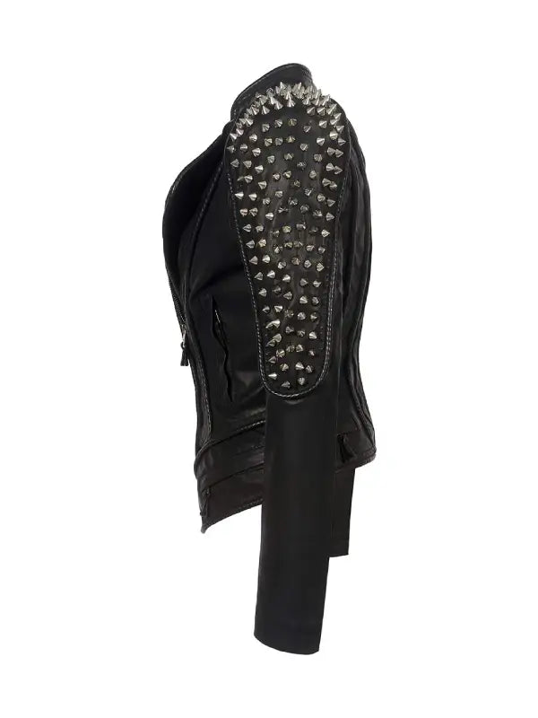 This women’s black studded leather biker jacket delivers a bold standout look that makes an instant statement. It is crafted from premium leather with a structured fit that shapes the body while giving a strong biker inspired style. The jacket features heavy metal spike studs along the shoulders and upper sleeves, creating a powerful and edgy appearance.