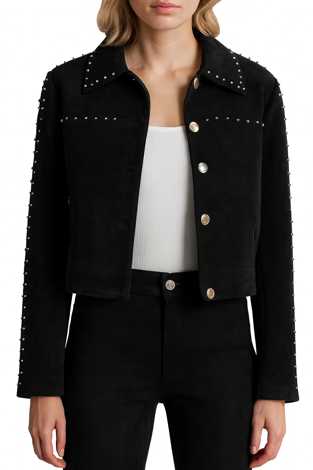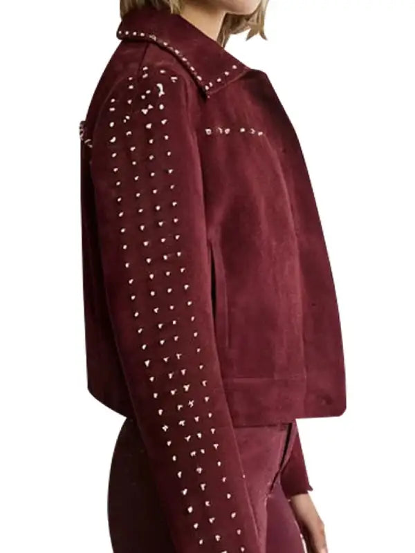 It has silver studs for some rock ‘n’ roll attitude. Cropped styling adds a modern flavour to the classic Suede jacket; therefore, the combination of sophistication and punk vibes. The stud embellishments are put in proper position on the sleeves, collar and back of this jacket that give this jacket a stylish look. This jacket does not have excess fabric for an oversized look, has buttons on the front and comes in dark red color that can be worn at any time of the year and any occasion. This jacket is indeed an accessory that every stylish lady should have in her wardrobe if not for jeans then for leather.