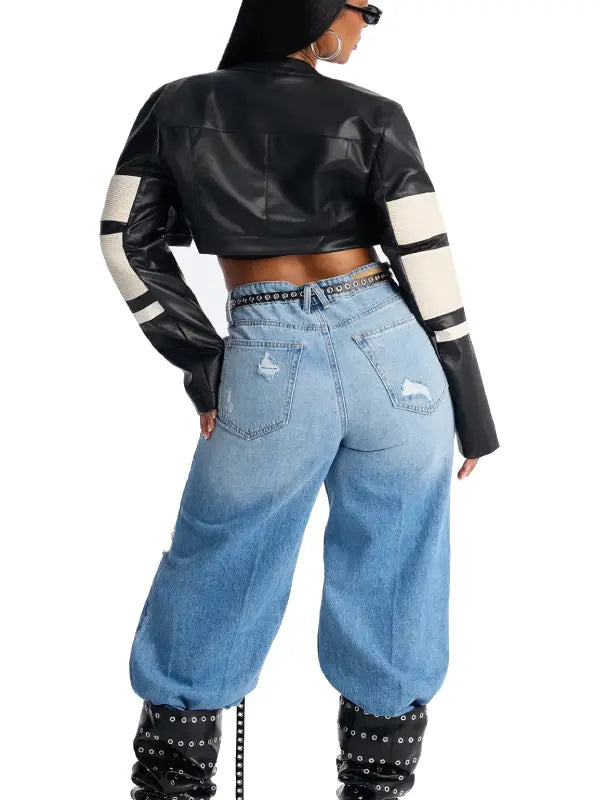 Turn heads with this bold women’s cropped biker jacket, designed for statement streetwear looks. Crafted from premium faux leather, this jacket features a sleek black base accented with sharp white racing stripes for a modern, edgy finish. The cropped length highlights the waist, making it perfect to pair with high-rise jeans, skirts, or leather pants.
