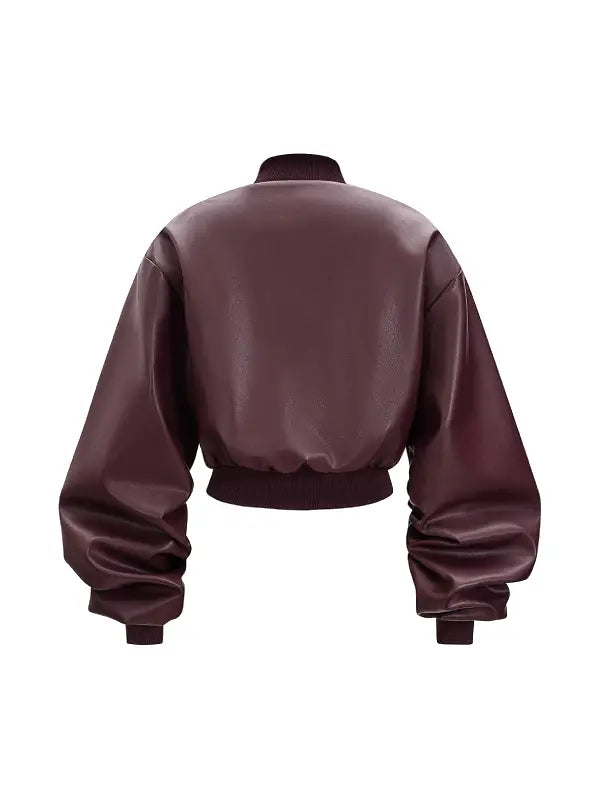 The cropped leather jacket features a structured high collar, full sleeves with soft gathering, ribbed cuffs, and a secure front closure. The matching pencil skirt is crafted with a smooth contouring finish, a back slit for movement, and a tailored waist that enhances curves.