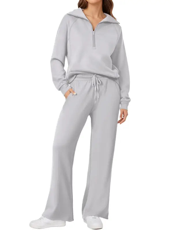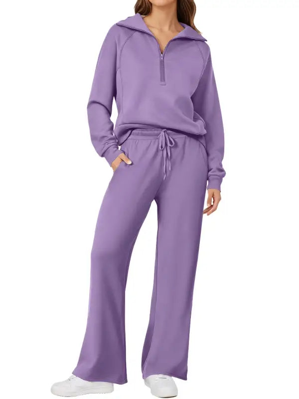 This women’s multi color lounge set brings comfort and style together in one easy outfit. The soft half zip top pairs perfectly with relaxed wide leg pants for a cozy, laid back look. Whether you are at home, running errands or traveling, this set keeps you comfortable with its breathable fabric and flattering fit. A must have everyday essential.