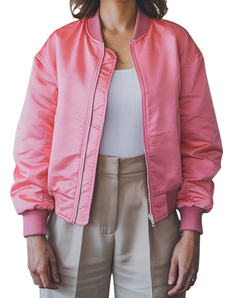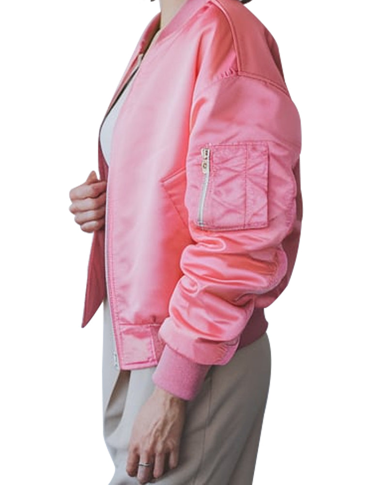 This is a Vibrant Pink Satin Bomber Jacket for the contemporary woman who wants to make a statement with her fashion. This jacket is made of smooth satin fabric with bomber jacket style, ribbed cuffs, hem, and collar for comfortable and close to body fitting. The color is bright pink which gives it a cute and trendy look and feel; it is also made of light material hence comfortable to wear the whole day. Perfect to be worn over your regular t-shirts and jeans or to be styled with chinos and shirts, this bomber jacket is a fashionista’s delight. The zippered pockets add functionality and it’s ideal for working women.