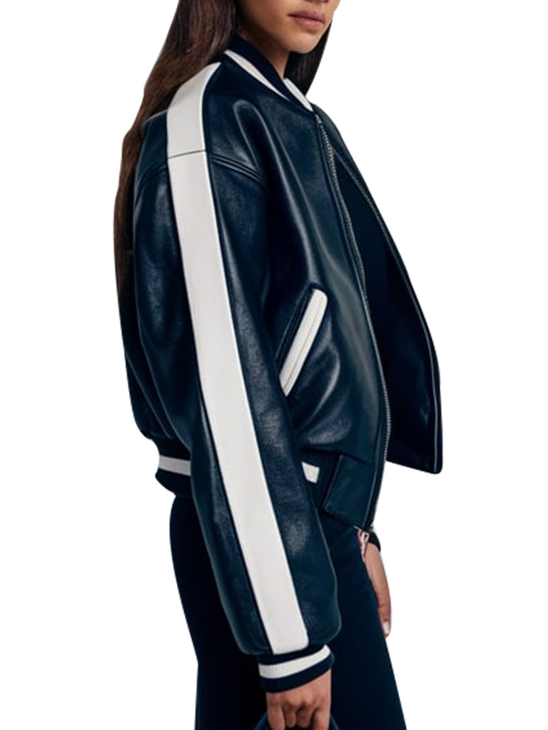 This women’s black leather varsity jacket is designed with white stripes along the sleeves to give you that chic and fashionable look. Especially for the people who are oriented on the latest trends, this jacket has been created using the elements of traditional varsity style supplemented by spices of modernity. It is made of genuine leather for a long-lasting wear and also for that rich, smooth feel. The ribbed cuffs, hem, and collar are striped, and the neat fitting makes them quite warm and comfortable. At any time whether it is a simple outing or else aiming for the dramatic effect, this jacket is a perfect one to wear. Wear it with a good dress to complement it to give you that classy look.