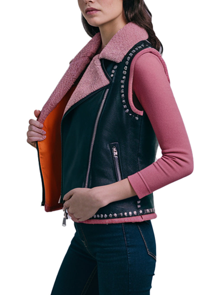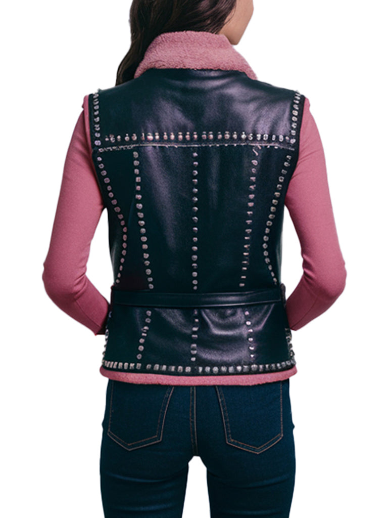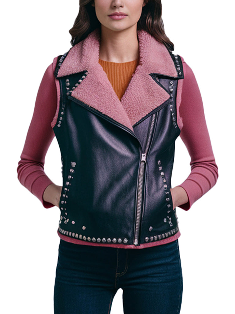 Elevate your style with this chic Women's Black Leather Vest featuring a striking pink faux shearling collar and edgy stud detailing. Designed for the modern woman, this vest blends luxurious leather with playful accents, making it a perfect choice for both casual and stylish ensembles. Whether layered over a sweater or worn as a statement piece, this vest offers both comfort and a unique fashion-forward look.