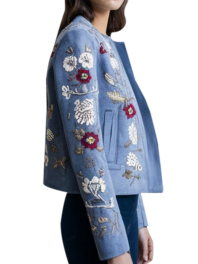 This is a well made women’s blue embroidered jacket which gives a classic appeal. With floral embroidery on the front, back and sleeves, this jacket brings a certain level of class to your outfit. This jacket has most elegant fabric used in making of the jacket enhances the structure of the jacket as well as comfort. The floral patterns are fine detailed in red, white and gold and is ideal for those who love intricate work. Whether you’re going out during the day or going to a party, this jacket will make you look fashionable and trendy.