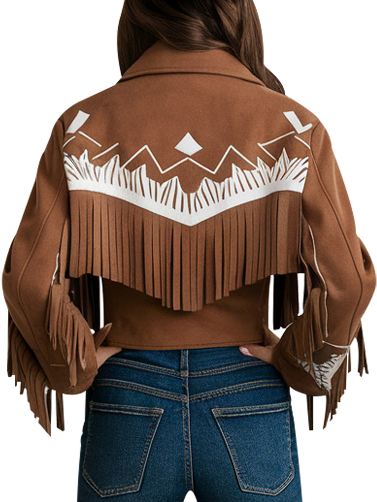 Enjoy the spirit of Wild West in this women’s brown fringe western jacket. This is suitable for today’s cowboy fashion chic wear with intricate white Print on the attire and extended fringe finishings on the arms and the back. Hybrid of soft suede brings it a luxury element, while the cropped length – modernity. Ideal for dressing up any casual or festival look, this jacket is perfect for wearing with jeans or skirts, so you’ll be turning heads wherever you go.