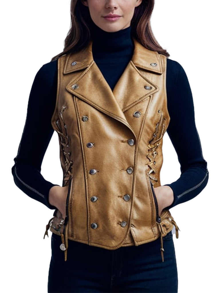 Elevate your style with this Women's Brown Leather Vest featuring bold lace-up detailing on the sides. Crafted from premium leather, this vest offers a perfect blend of elegance and edge. The rich brown color adds warmth to any outfit, while the double-breasted front with snap buttons gives it a polished look. The adjustable lace-up sides allow for a customized fit, making it a versatile piece for various body types. Whether you're dressing up for a night out or adding a statement piece to your everyday wardrobe, this leather vest is a must-have.