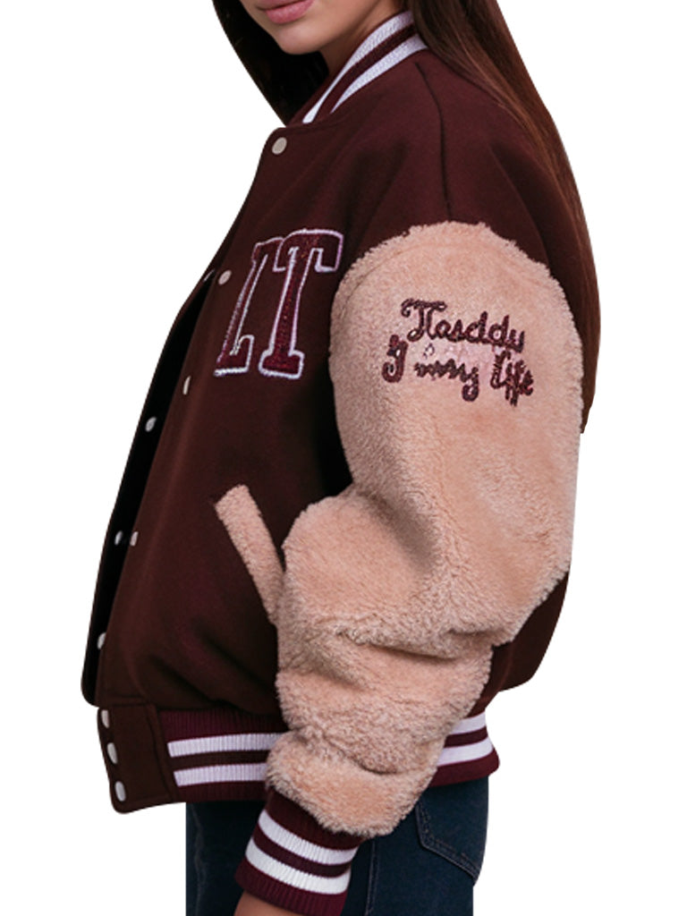 This Women’s Brown Varsity Jacket is a great piece of clothing which is both stylish and comfortable, with a playful touch. This jacket has teddy bear embroidery on the sleeve and is made from soft plush material on the arms, so it will be perfect for those who like to add a playful element to their clothing. It has a varsity style snap button front closure, rib knitted collar and cuffs and a regular fit that is warm and fashionable. Whether you are going out for a casual dinner or want to make a statement with a statement piece of outerwear, this jacket gives a nice touch to your outfit.