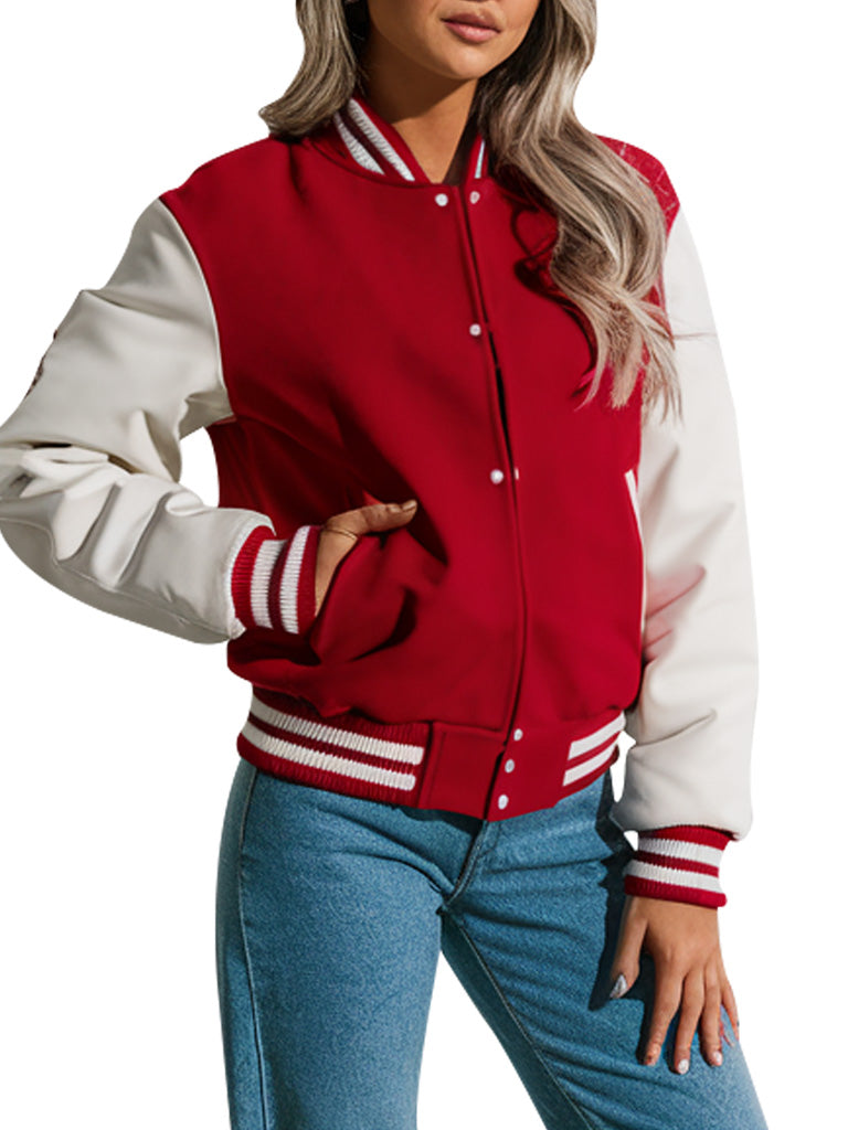 Stand out from the crowd with this Women’s Red & White Varsity Jacket that has a traditional letterman look that will never go out of fashion. Made from high quality materials, this jacket is easy to wear and comfortable to wear for casual occasions. The red body with white sleeves and ribbed cuffs gives the wearers a sporty but elegant look to their attire. This is ideal for wearing as a layer, it has working front pockets and comes with a snap button front fastening. Whether you are going out for a casual dinner or going for that casual look, this varsity jacket is perfect for the laid back look.