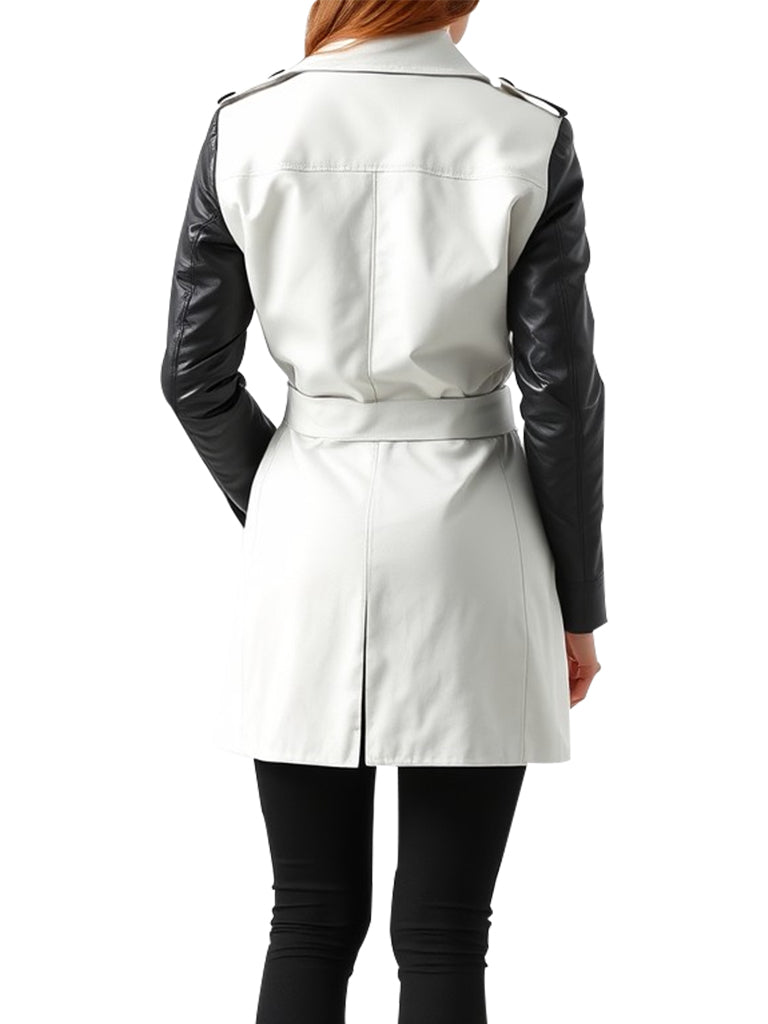 Add a modern twist to your outerwear collection with our Women's Contrast Sleeve Belted Trench Coat. This chic trench coat features a classic white body paired with striking black leather sleeves, creating a bold and sophisticated look. The belted waist cinches for a flattering silhouette, while the double-breasted front with button details adds a touch of timeless elegance. Ideal for both day and night wear, this versatile coat combines practicality and style, making it a must-have for any fashion-forward wardrobe.
