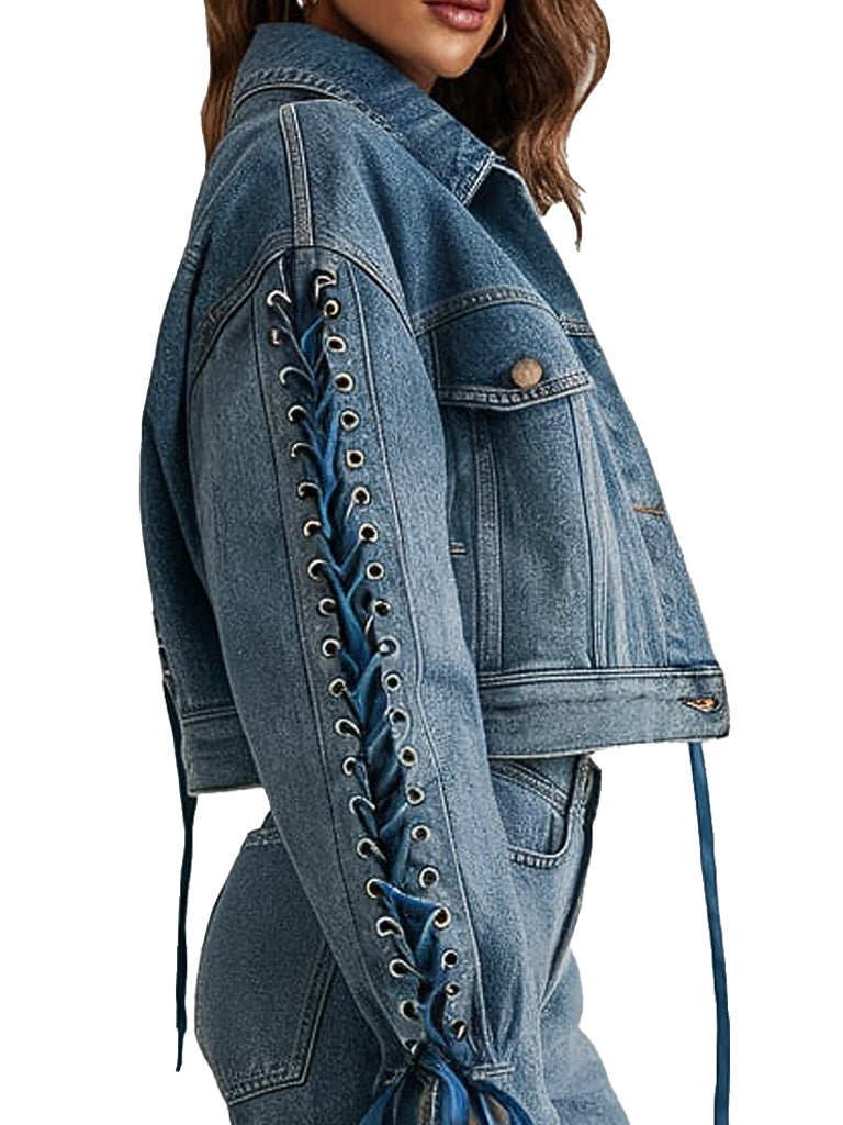 Make a bold fashion statement with this Women's Cropped Blue Denim Jacket, featuring eye-catching lace-up sleeve detailing. Crafted from high-quality denim, this jacket combines a classic look with modern flair. The cropped fit adds a trendy twist, while the lace-up sleeves provide an edgy, fashion-forward touch. Perfect for those who love to stand out, this jacket is ideal for layering over your favorite tops and pairing with high-waisted jeans or skirts.