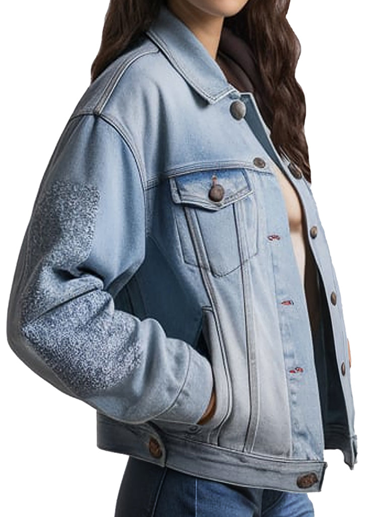 Elevate your casual wardrobe with this Women's Cropped Light Blue Denim Jacket featuring stylish textured sleeves. Crafted from premium denim, this jacket offers a modern twist on a classic staple. The cropped fit adds a trendy edge, making it perfect for pairing with high-waisted jeans or skirts. The jacket is designed with a button-front closure, two chest pockets, and a classic shirt-style collar. The textured detailing on the sleeves provides a unique and eye-catching element that sets this jacket apart from the rest. Whether you're heading out for a casual day out or adding an extra layer to your outfit, this denim jacket is a versatile choice for any occasion.