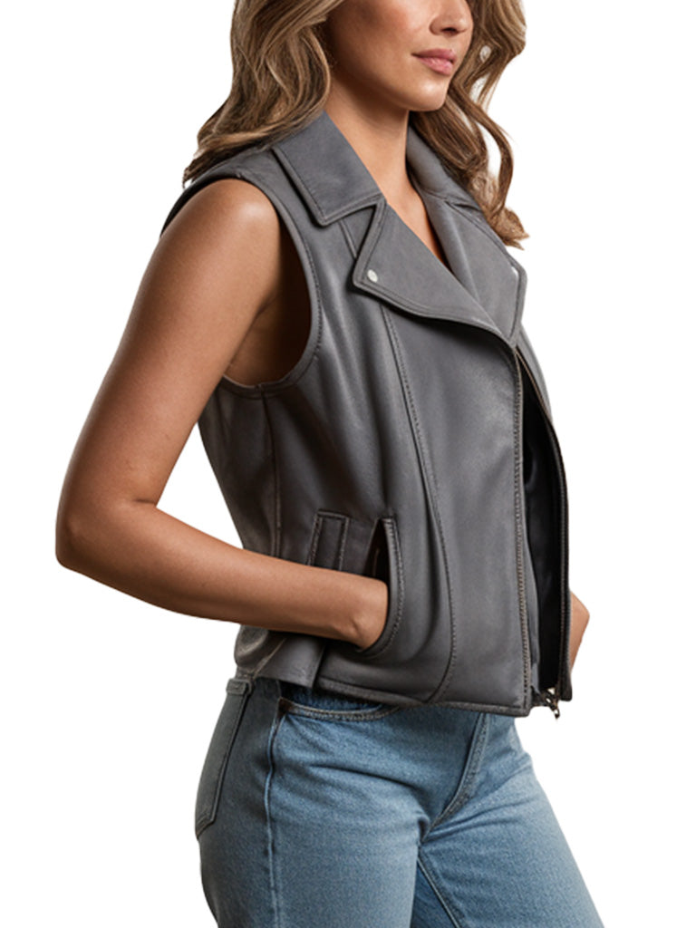 This Women's Gray Sleeveless Biker Leather Vest combines sleek style with ultimate comfort. Crafted from premium leather, this vest is designed for fashion-forward individuals who appreciate both quality and aesthetics. The soft gray hue adds a touch of modern elegance, making it versatile enough to pair with any outfit. Whether you're hitting the open road or simply looking to elevate your casual look, this leather vest is the perfect choice. The asymmetrical zipper and classic biker details make it a timeless addition to your wardrobe.