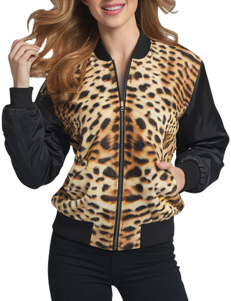 This Leopard Print Bomber Jacket with Black Sleeves is the perfect blend of bold and chic. Featuring a striking leopard print front, this jacket adds a fierce edge to any outfit, while the contrasting black sleeves and ribbed cuffs provide a sleek and modern touch. Crafted from durable materials, it is both stylish and comfortable, making it ideal for casual outings or standout moments. The jacket is finished with a zip-up closure and side pockets, ensuring functionality alongside its fashion-forward design.