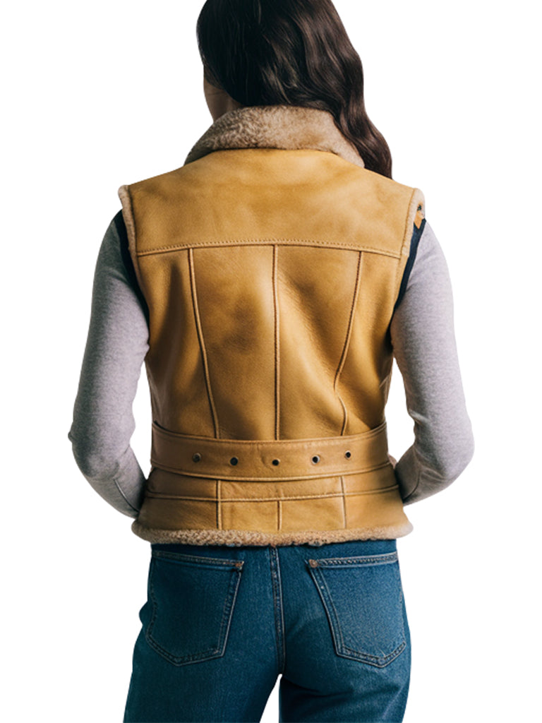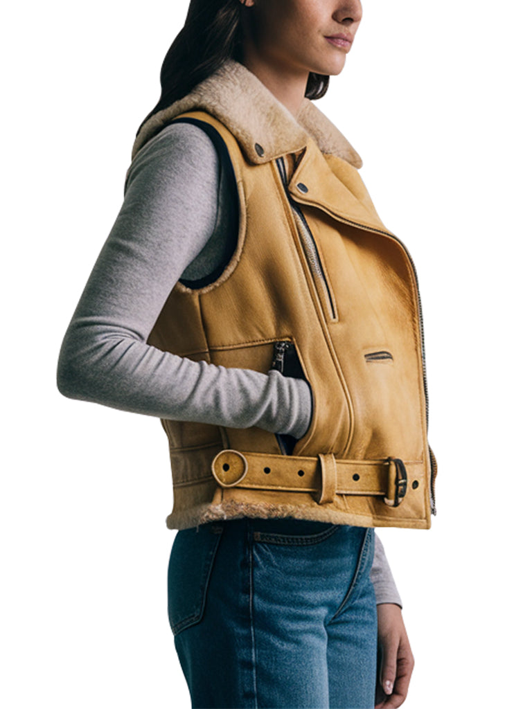 Look no further for the ultimate combination of elegance, sophistication and comfort with our Women’s Mustard Leather Shearling Collar Biker Vest. Made of high-quality leather material, this vest is meant to have a stylish and at the same time a tough look. The shearling collar provides warmth and the belted waist and the asymmetrical zipper closure give it a biker feel which is perfect for cooler days. This vest is ideal to be worn over a sweater or a simple T-shirt, thus it can be worn both while riding and during other activities that require formal or business casual attire.