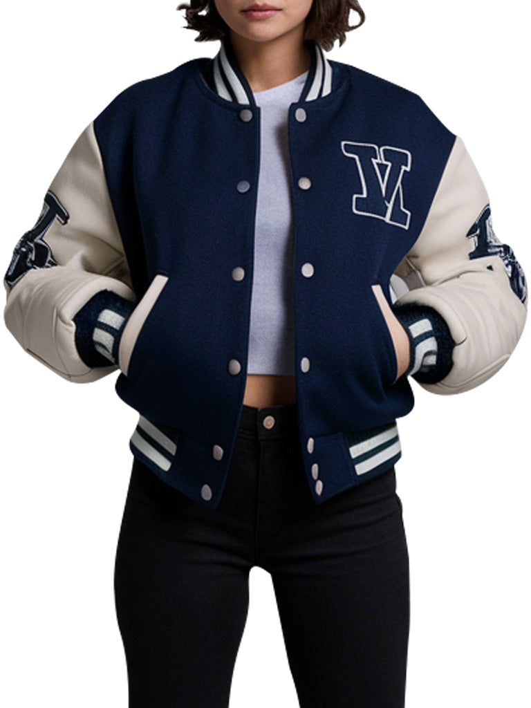This Navy Blue Varsity Jacket has cream colored sleeves and the letter patches on it are very loud and clear. This jacket is meant to be comfortable and practical, and it achieves it by blending the traditional varsity jacket with modern elements. Made from luxurious fabrics, it provides warmth and comfort to chilly weather and due to its oversized design, it can be worn over any garment. The cuffs, hem and collar are ribbed to give a sporty look and feel and the snap button placket makes it easy to wear. Whether you are going for a casual affair or making a fashion statement, this varsity jacket should be part of your wardrobe.