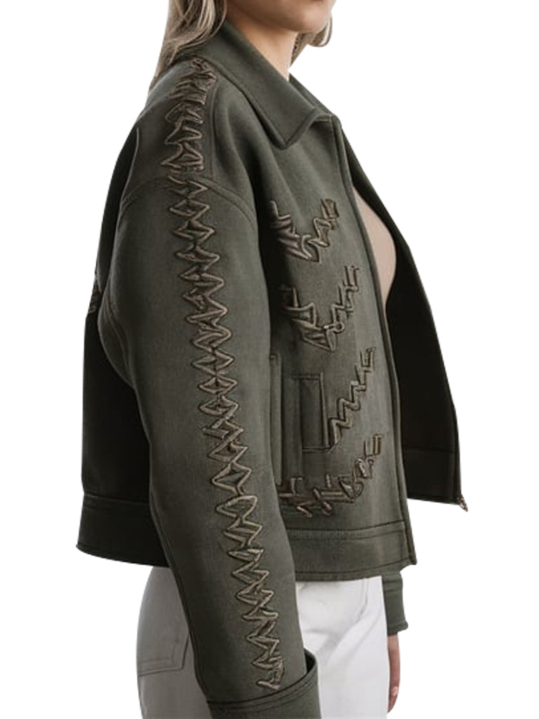 Step into contemporary fashion with this women's olive green embroidered cropped jacket, designed for those who appreciate unique detailing. Featuring intricate zigzag embroidery along the sleeves and body, this jacket offers a bold and modern look. The cropped fit and soft fabric make it perfect for layering, whether you're dressing up for a casual day out or aiming for a stylish evening look. With a button-up closure and classic collar, this jacket adds both texture and sophistication to your wardrobe, making it an essential piece for versatile styling.
