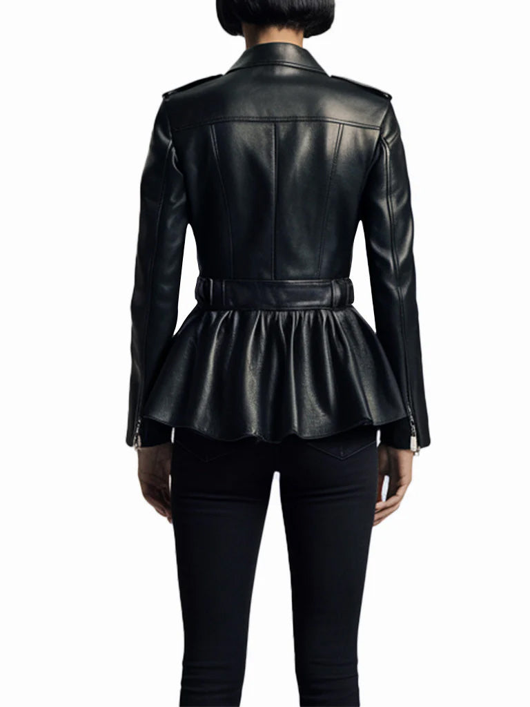 This women's motorcycle jacket is a stylish blend of edgy and feminine design. Made from high-quality leather, it features a classic black color with a unique peplum hem that adds a touch of elegance and flair. The jacket includes a notched lapel collar and asymmetrical zipper closure, maintaining its traditional biker look. The fitted silhouette highlights the waist, while the peplum hem creates a flattering and chic appearance. With zippered cuffs and front pockets for practicality, this jacket combines functionality with fashion. It's a perfect choice for those looking to add a fashionable twist to their wardrobe.