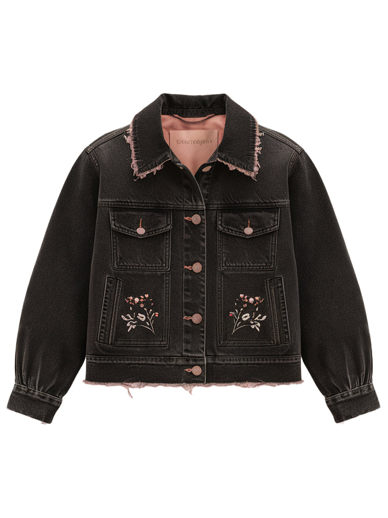 This black denim jacket stands out with its intricate pink floral embroidery and stylish frayed collar, making it a must-have addition to your wardrobe. Designed with a relaxed fit, it's ideal for layering over tees or sweaters, providing comfort and a chic, vintage appeal. The front button closure and convenient flap pockets add practicality, making this jacket not only fashionable but functional. Embrace the perfect blend of classic and contemporary with this beautifully crafted denim piece.