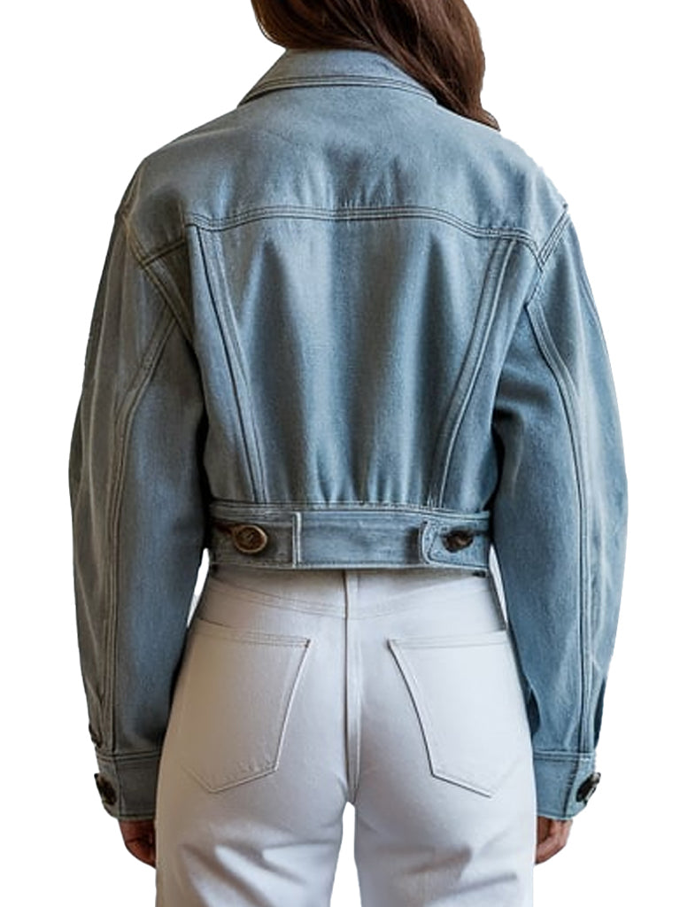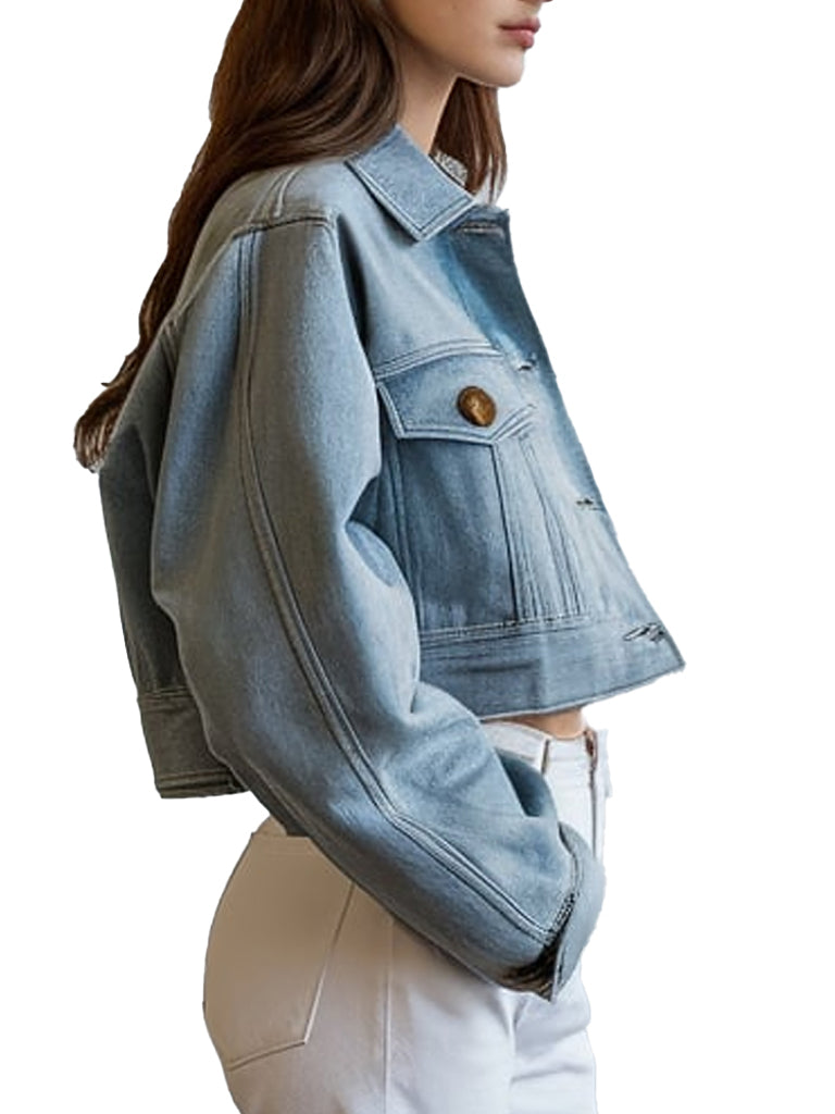 Upgrade your wardrobe with this stunning light blue cropped denim jacket, perfect for any casual outing. Made from high-quality denim, this jacket features a stylish cropped fit that pairs effortlessly with high-waisted jeans or skirts. The classic turn-down collar and bronze button-front closure add a vintage vibe. Designed with chest flap pockets, this jacket is both practical and fashionable, making it a must-have for any fashion-forward individual.